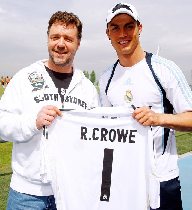 | Ronaldo chụp ảnh cùng nam tài tử Russell Crowe khi anh tới thăm Madrid. |