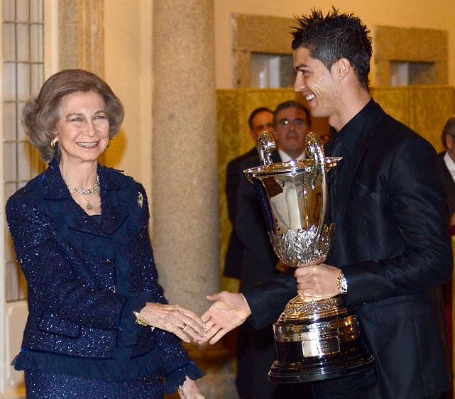 | Nữ hoàng Tây Ban Nha trao phần thưởng danh giá cho Ronaldo tại cung điện El Pardo ở Madrid. |