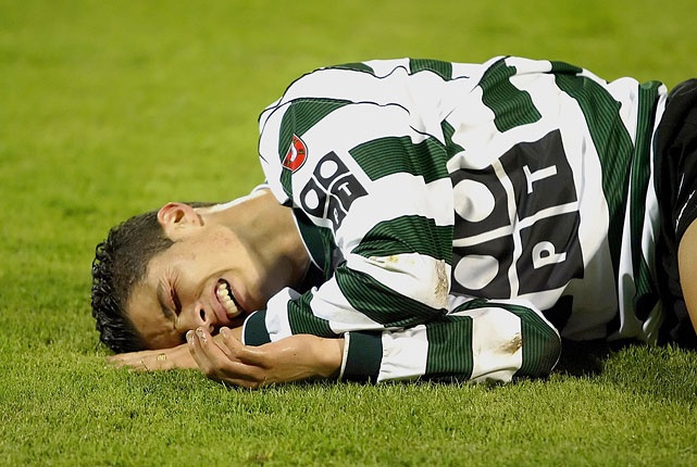 | Tài năng trẻ của Sporting Lisbon vật vã khóc khi dính một chấn thương nghiêm trọng năm 2002. |