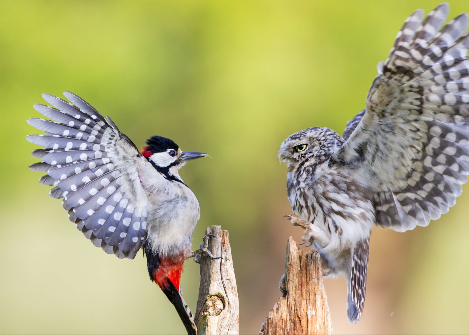 | Chim cú nhỏ (phải) bảo vệ lãnh thổ trước sự xâm lấn của con chim gõ kiến (trái) tại một khu rừng ở Droitwich, Anh. Ảnh: National Geographic |