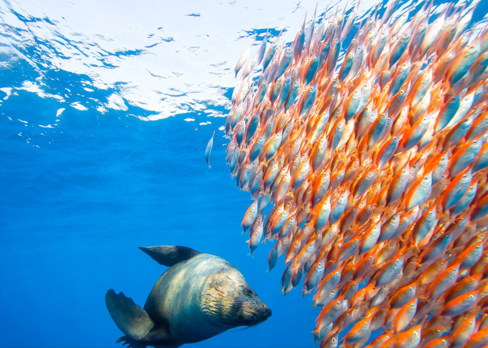| Hải cẩu săn đàn cá màu cam sặc sỡ ở Sydney, Australia. Ảnh: National Geographic |