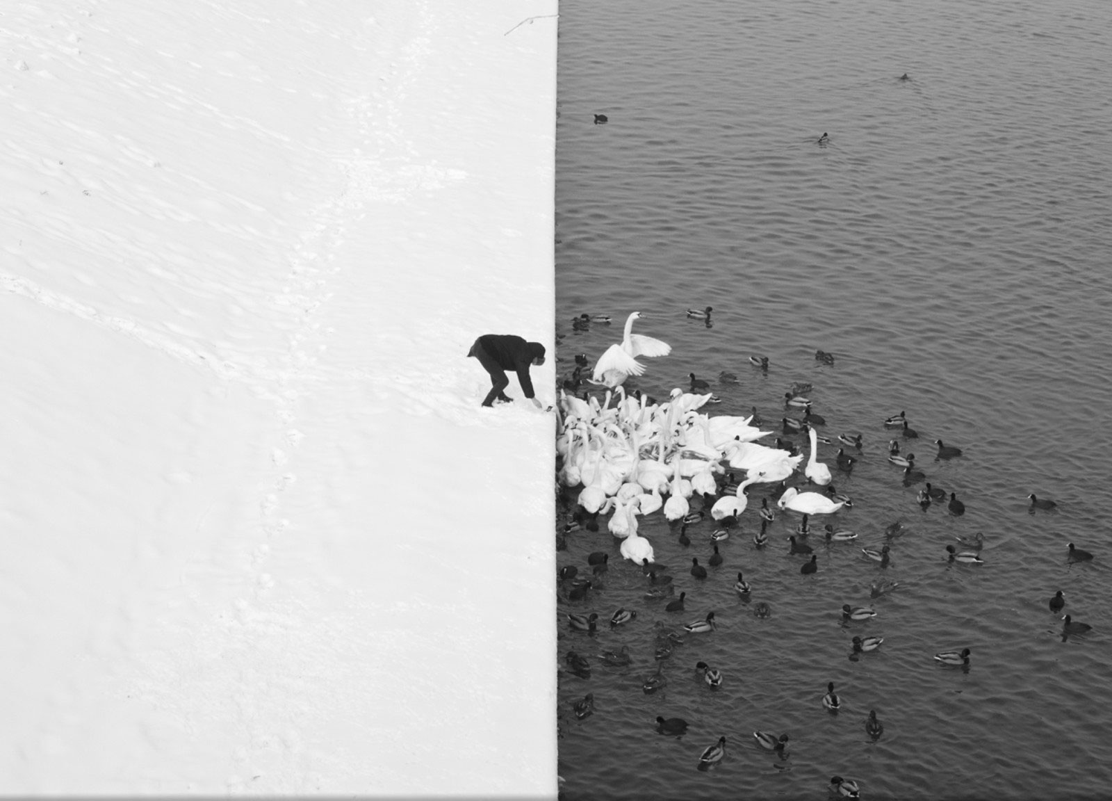| Một người đàn ông cho đàn thiên nga ăn ở Cracow, Ba Lan. Ảnh: National Geographic |