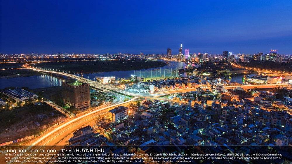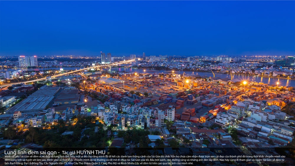 | Bộ ảnh được đánh giá cao về cách xử lý ống kính và ánh sáng vô cùng tinh tế. Tác giả đã đưa người xem dạo ngắm Sài Gòn về đêm và từ trên cao từ bến Bạch Đằng, đại lộ Đông Tây, cầu Nguyễn Văn Cừ, khu cầu Thủ Thiêm quận 2, cảng Phú Mỹ và kênh Nhiêu Lộc. Sài Gòn về đêm không chỉ lung linh bởi nhà cao tầng, những khu phố sầm uất mà bởi những con kênh xanh uốn lượn như dáng thiếu nữ, dịu dàng và mềm mại. |