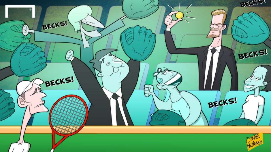 | Ngày 9/7: Cựu tiền vệ David Beckham trở thành tâm điểm của sự chú ý khi dự khán Wimbledon. Sau cú đánh của Jamie Murray, bóng bay lên khu khán đài VIP. Với sự nhanh nhạy của người từng chơi thể thao, cựu sao Manchester United dễ dàng tóm gọn trái bóng. |