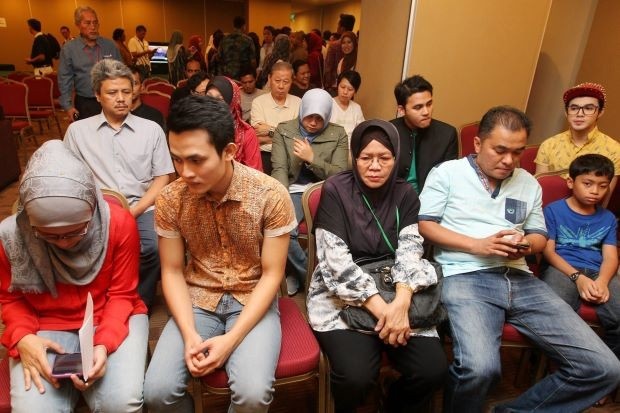 | Người nhà của hành khách trên chiếc Boeing 777 gặp nạn thấp thỏm chờ thông tin từ chính quyền tại khách sạn JW Marriot ở Kuala Lumpur, Malaysia. Nhiều người cập nhật thông tin với hy vọng mong manh rằng, thân nhân họ không có mặt trên chuyến bay. Ảnh: The Star |