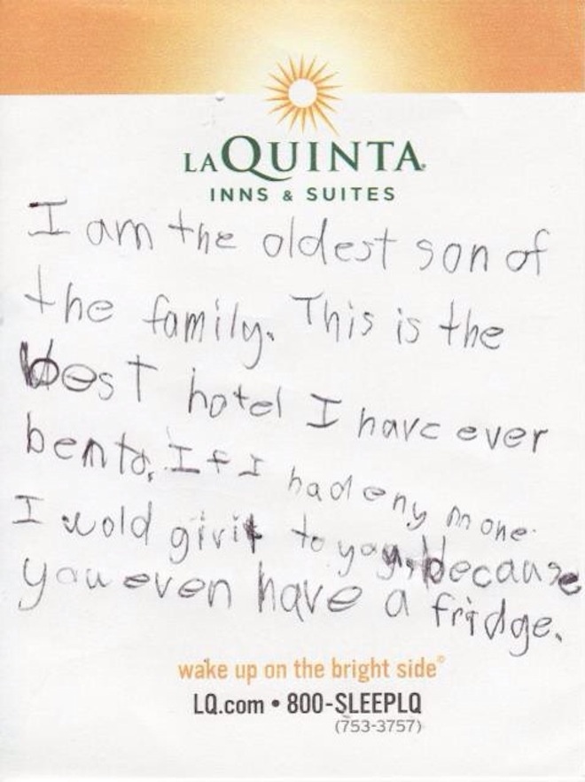 | Trẻ em đôi lúc thường hay thích ghi lại suy nghĩ của mình lên giấy. Trong ảnh bé trai đang viết một lời nhắn với đầy vẻ thích thú tới… khách sạn: "Tôi là con trai lớn nhất trong gia đình. Đây là khách sạn tốt nhất mà tôi đã từng ở. Nếu tôi có tiền, tôi sẽ đưa cho bạn bởi vì bạn có tủ lạnh". |