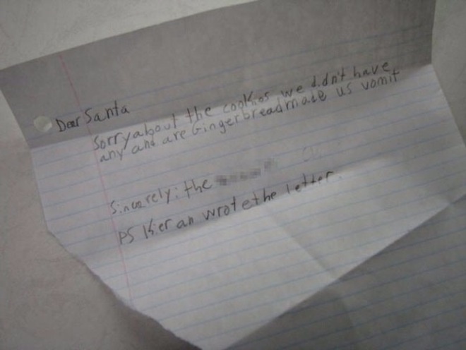 | Những dòng cảm xúc của trẻ hay được viết dưới dạng một lá thư, lời nhắn, trên một tấm thiệp… gửi đến người mà mình yêu quý. Trong ảnh là bức thư gửi đến ông già Noel như một lời trách móc: "Ông già Noel thân mến. Thật tiếc khi chúng cháu đã không có bất kỳ cái bánh quy nào và bánh mỳ gừng khiến chúng cháu muốn nôn ra. PS: Keran đã viết lá thư này". |