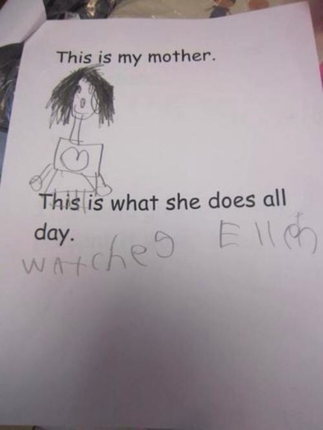| Nét chữ, nét vẽ còn vụng về nhưng hết sức chân thực của trẻ. "Đây là mẹ của tôi. Đây là những gì mẹ làm suốt cả ngày: xem Ellen". |