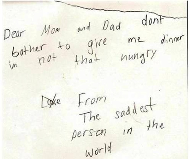 | Lời nhắn đầy ẩn ý với lời yêu bố mẹ bị gạch bỏ: "Bố mẹ đừng bận tâm về bữa tối cho con. Con không đói. Từ đứa trẻ buồn nhất trên thế giới". |