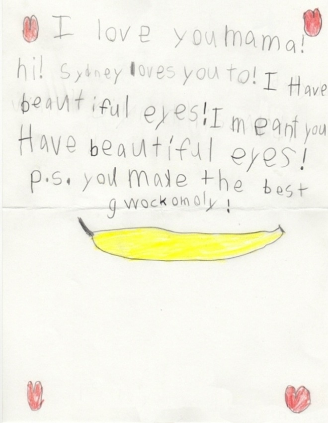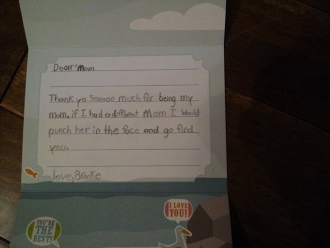 | Lời yêu thương "hung bạo" của cô bạn nhỏ Brooke: "Mẹ thân mến. Cảm ơn mẹ rất nhiều vì là mẹ của con. Nếu có ai khác làm mẹ, con sẽ đấm vào mặt cô ta và đi tìm mẹ. Yêu mẹ, Brooke". |