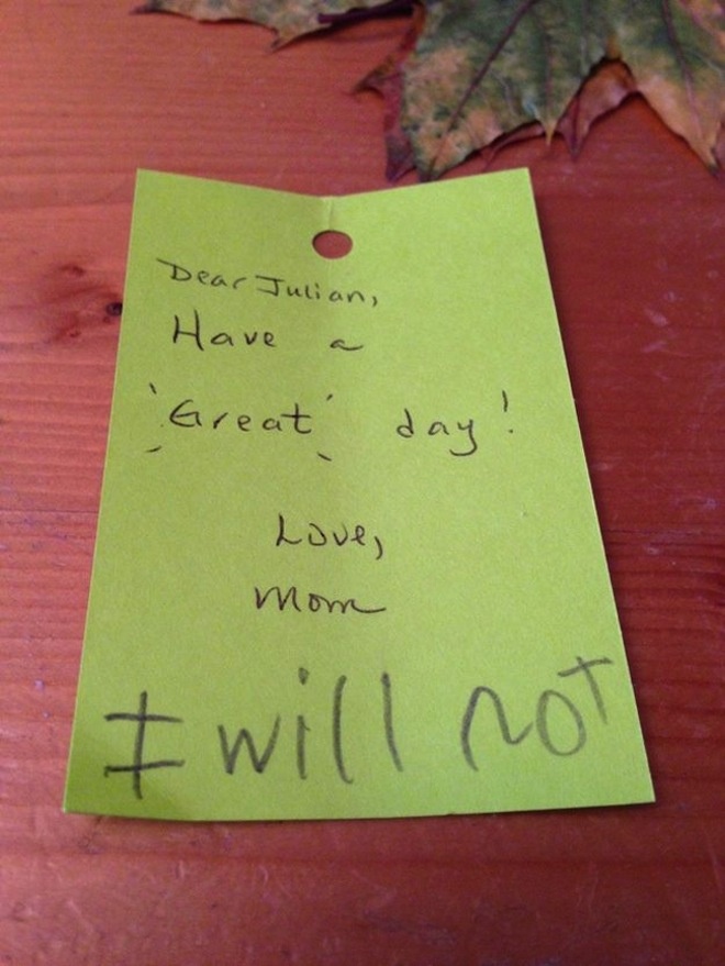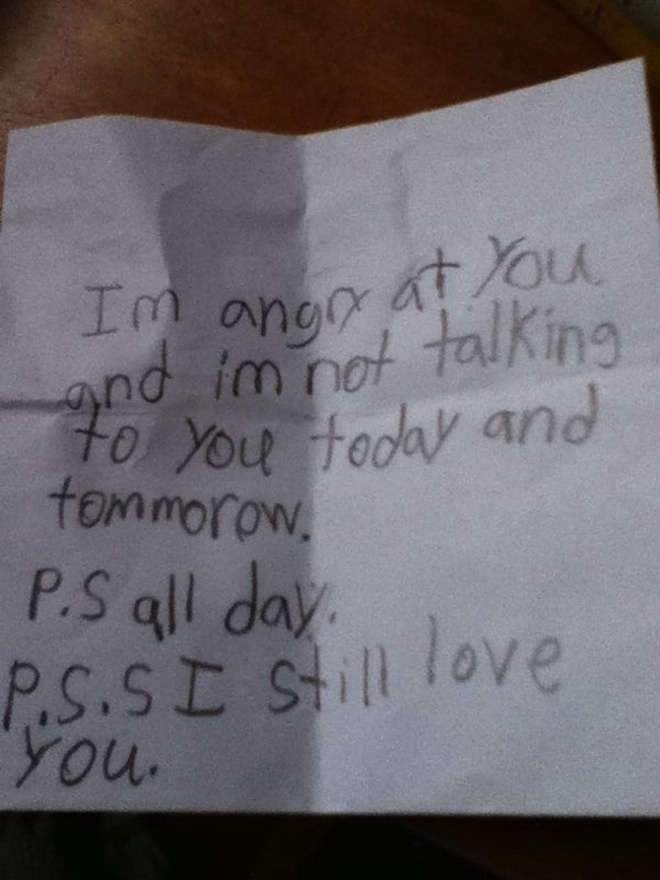 | "Con rất bực mình mẹ và con sẽ không nói chuyện với mẹ hôm nay và ngày mai. P.S cả ngày. P.S.S con vẫn yêu mẹ". |