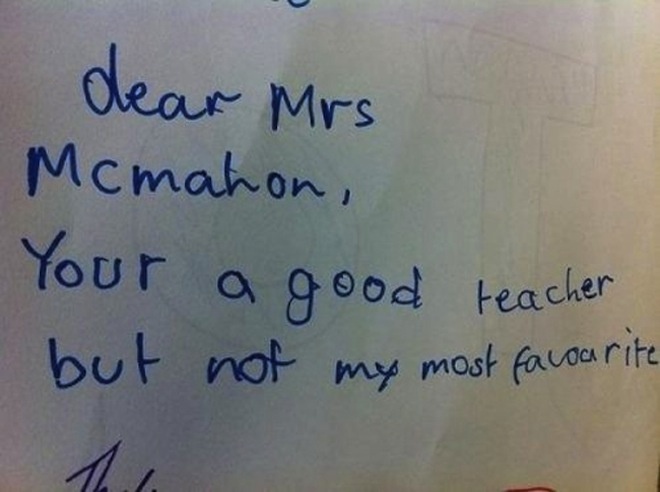 | Thầy cô giáo cũng là đồi tượng thường xuyên được nhận những lời nhắn dễ thương. Trong ảnh cậu học trò viết: "Thầy Mcmahon thân mến, thầy là một thầy giáo tốt nhưng không phải là kiểu em thích". |