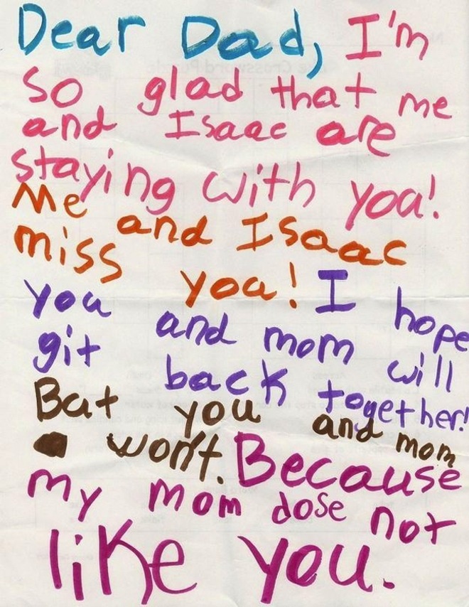 | Mong ước đầy nghẹn ngào của một em bé: "Bố yêu quý, con rất vui nếu con và Issac được ở cạnh bố. Con và Issac nhớ bố. Con hy vọng bố và mẹ sẽ quay lại với nhau. Nhưng bố mẹ sẽ không. Bởi vì mẹ không thích bố". |