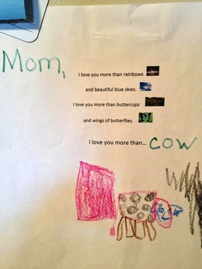 | Tận dụng những lời trong sách giáo khoa, một cô bé đã nói yêu mẹ hơn cả cầu vồng, bầu trời, cánh bướm và hơn cả… con bò. |