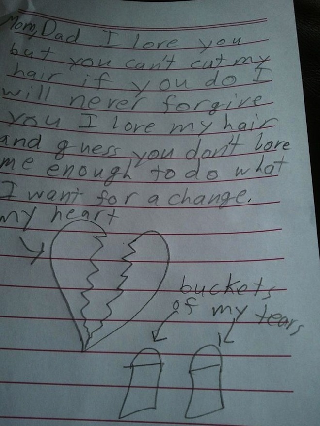 Một nỗi niềm muốn bày tỏ với bố mẹ của em bé khác bên cạnh hình ảnh trái tim tan vỡ và hai chiếc xô đầy nước mắt: "Bố mẹ, con yêu bố mẹ nhưng con không thể cắt tóc của con. Nếu bố mẹ làm thế con sẽ không bao giờ tha thứ. Con yêu mái tóc của mình. Và con đoán bố mẹ không đủ yêu con để con được làm theo ý thích".