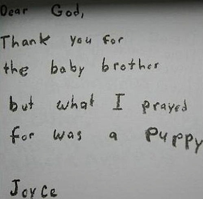 | Lời nguyện ước cũng không kém phần dễ thương của cậu bạn Joyce: "Ông trời thân mến. Cảm ơn ông vì đứa em trai nhưng con ước có một con chó con". |