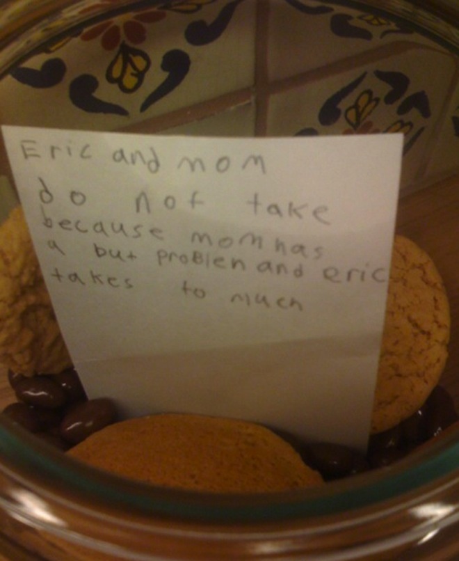 | Cảnh báo cấm ăn đồ đáng yêu: "Eric và mẹ đừng lấy đi. Bởi vì mẹ đã có một cái và Eric lấy quá nhiều rồi". |