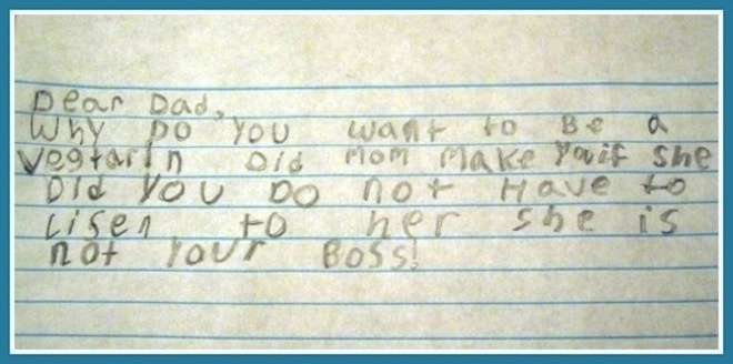 | Còn đây lại là lời khuyên hết sức hùng hồn dành cho bố: "Bố thân mến. Tại sao bố muốn trở thành người ăn chay. Có phải mẹ bắt bố làm giống mẹ. Bố không phải nghe lời mẹ. Mẹ không phải là sếp của bố". |