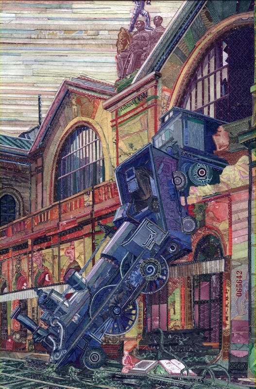 | Cận cảnh hình ảnh đầu tàu lao ra từ một tòa nhà ghép từ những tờ tiền màu xanh tím than. |