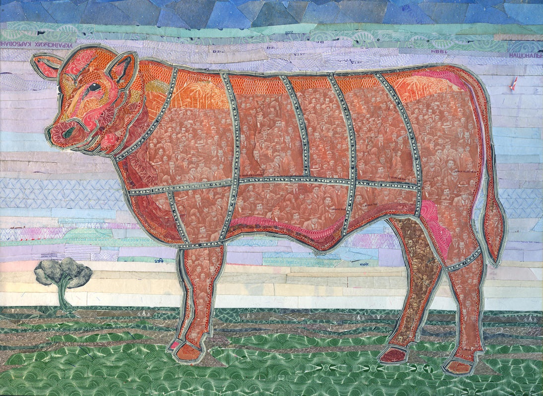 | Christopher C.K. Wilde, nghệ sỹ người Mỹ lấy cảm hứng cho những tác phẩm "ghép tiền" của mình từ câu hỏi con người luôn phải suy nghĩ: Nghệ thuật, xã hội và tiền bạc có quan hệ như thế nào? Trong hình là bức tranh "Con bò" ghép từ hơn mười loại tiền giấy rất sinh động. |