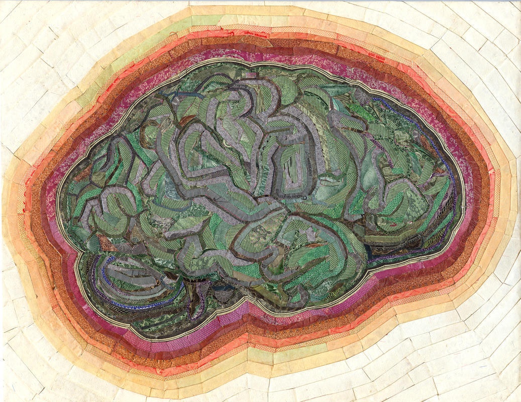| "Tiền chất đầy não" là tên gọi của bức tranh này. "Nó giúp tôi thấy những mâu thuẫn tồn tại giữa chủ nghĩa dân tộc và việc đi du lịch xuyên quốc gia", Wilde nói. Hình ảnh bộ não ghép từ những tờ tiền màu xanh trông giống hình ảnh lãnh thổ các nước nhìn từ vệ tinh. |