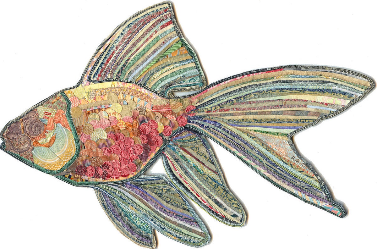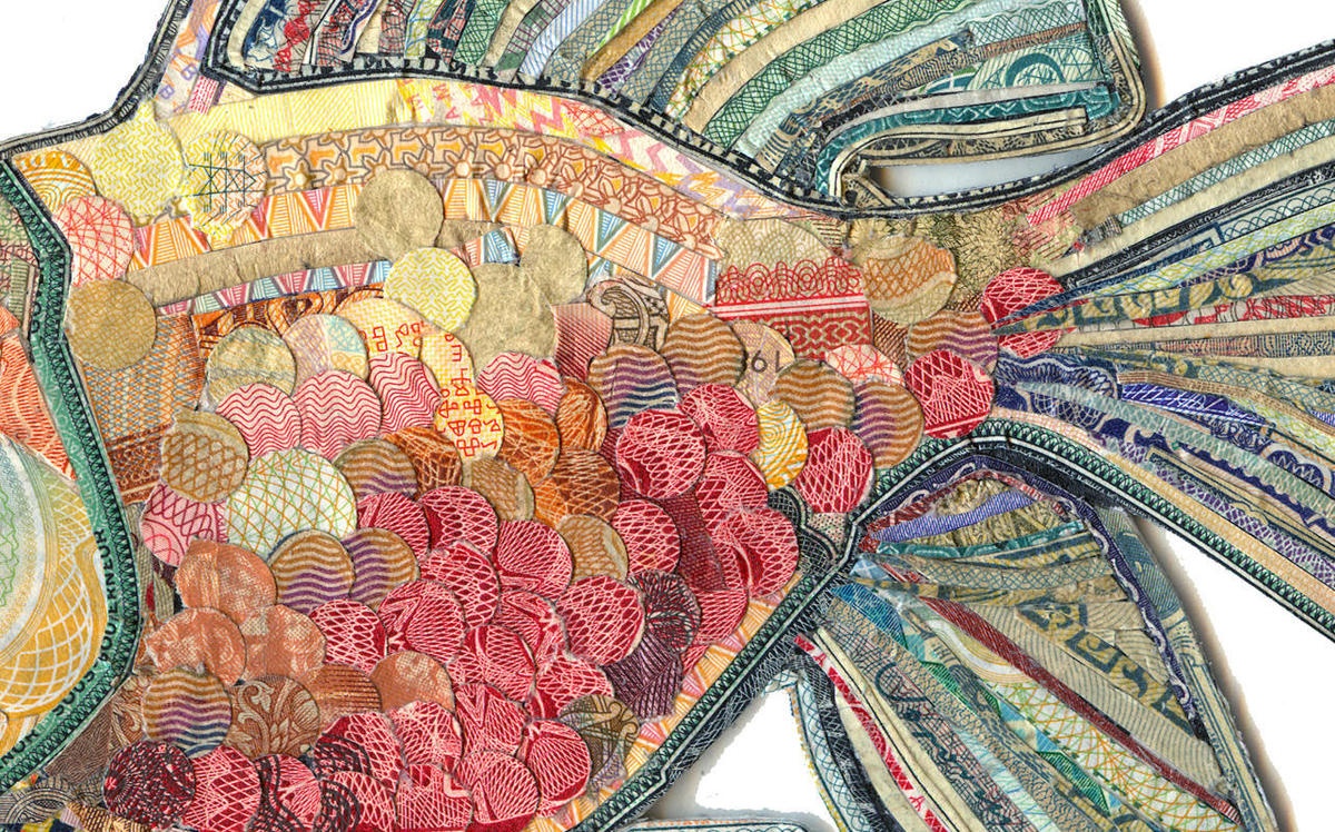 | Nghệ sỹ đã cắt những tờ tiền giấy thành hình tròn và ghép thành vảy cá. |