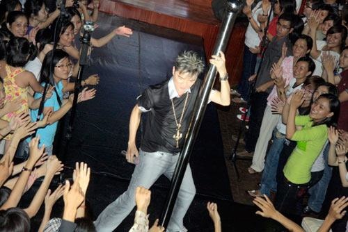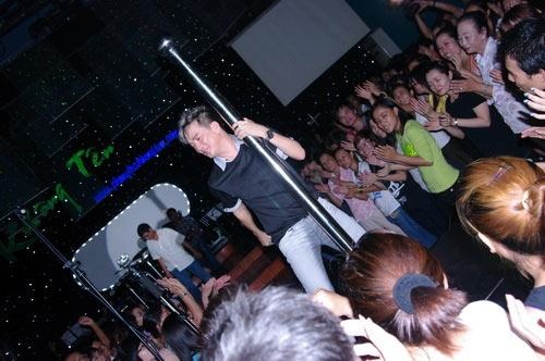 | Đàm Vĩnh Hưng không chỉ nổi tiếng với những phát ngôn táo bạo mà hình ảnh anh trên sân khấu cũng táo bạo không kém. Dù là một nam ca sĩ, nhưng màn múa cột của anh cũng khiến khán giả "nổ tung". |