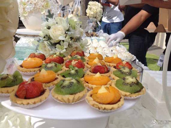 Đôi tân lang tân nương chăm chút từng chi tiết cho bàn tiệc ngọt. Ngó qua thực đơn có thể thấy hầu hết là các loại hoa quả vùng nhiệt đới, bánh cupcake tinh tế và tráng miệng với bánh macaron kiểu Pháp. Khách tới dự tiệc cũng được tặng những vật dụng đáng yêu có chữ ký của cặp đôi để làm kỷ niệm.