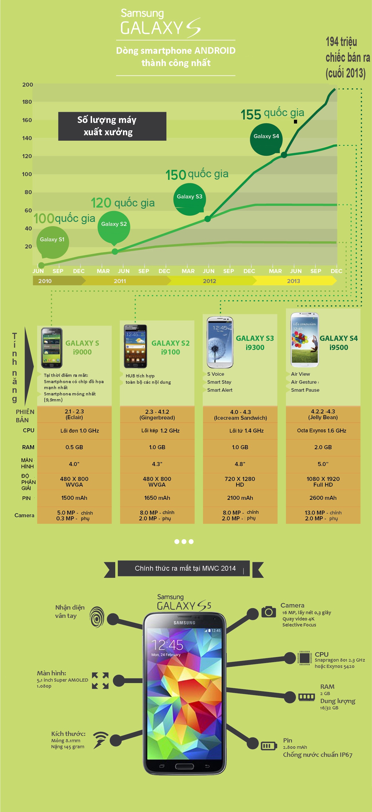 Trước khi Galaxy S5 ra mắt, Samsung đã bán được tổng cộng gần 200 triệu chiếc smartphone thuộc dòng Galaxy S. Hôm qua (24/2), hãng này đã trình làng thế hệ thứ 5.