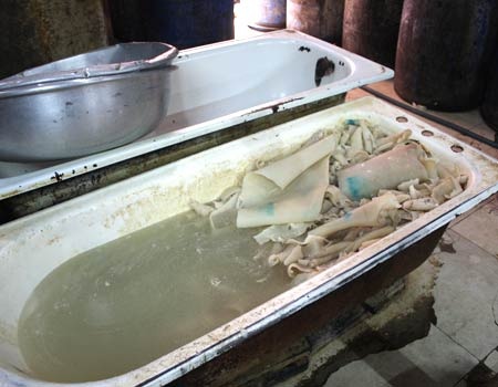 Bì lợn nguyên liệu được ngâm trong nước đục bẩn, sủi bọt. |