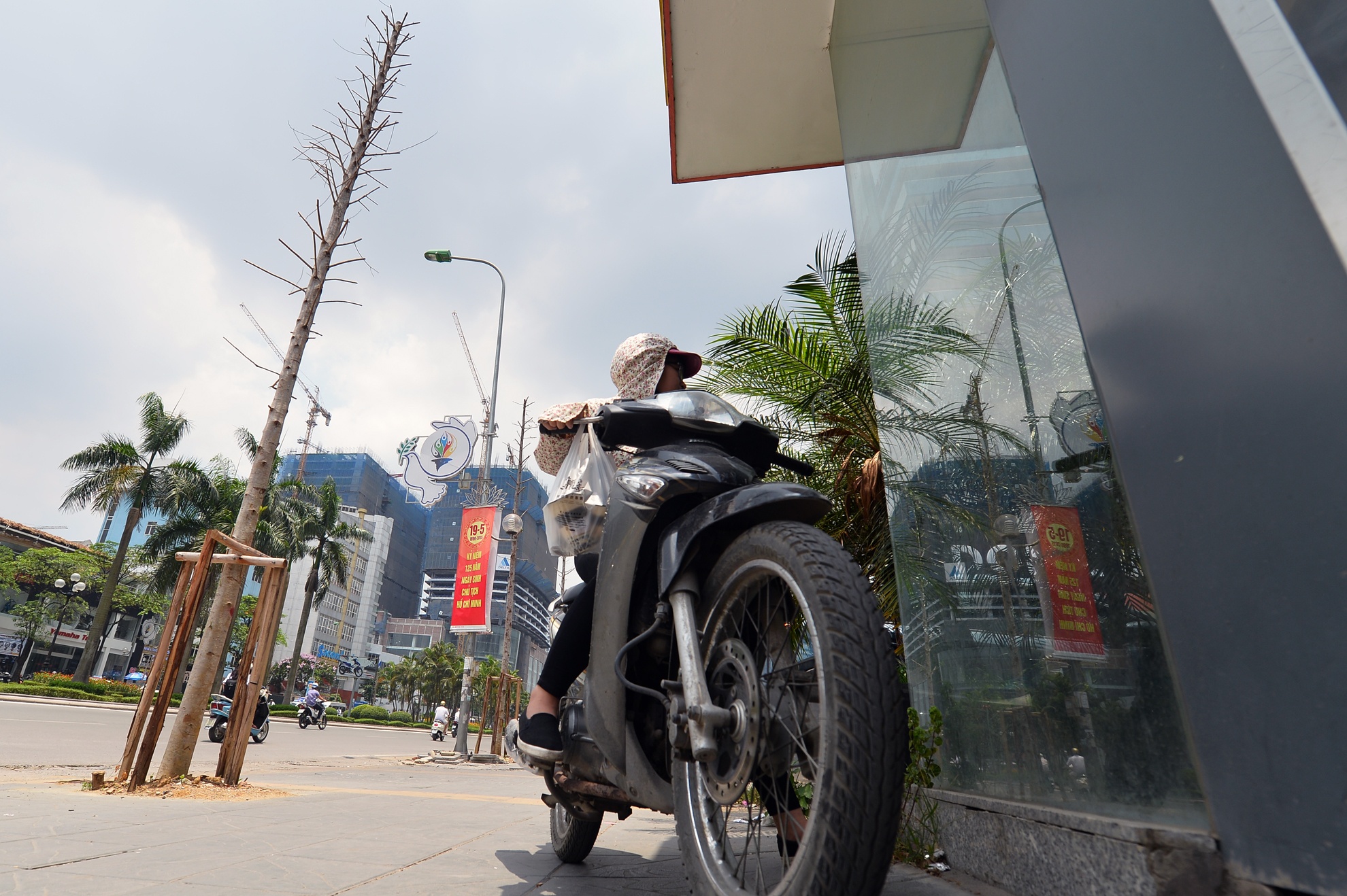 | Một cô gái tìm chút bóng mát nhỏ nhoi từ mái của trạm ATM gần cửa Đại học Luật Hà Nội. |