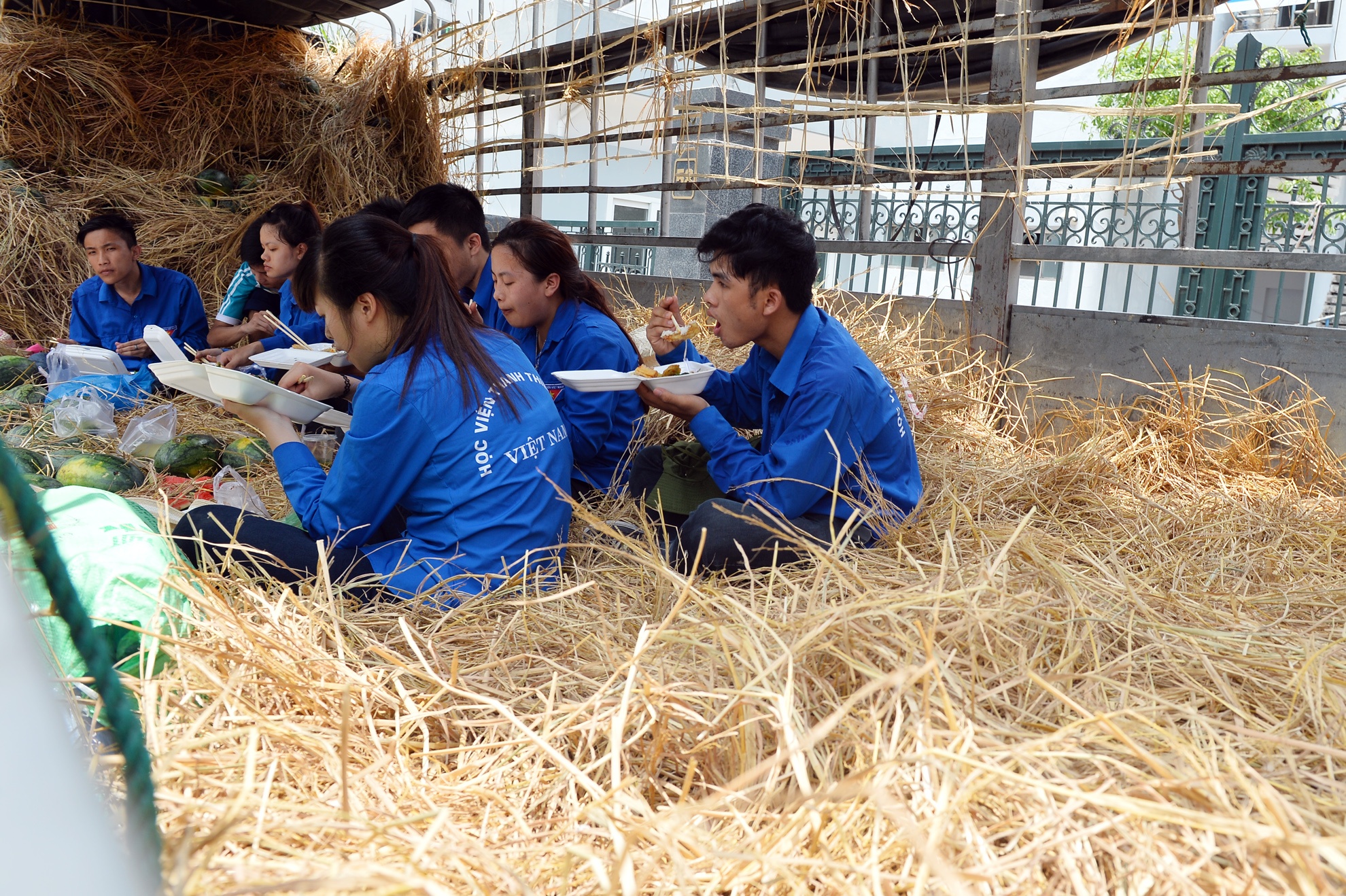 | Các sinh viên bán dưa hấu trước cửa Học viện Thanh thiếu niên phải chui dưới gầm xe tải ăn cơm hộp. |