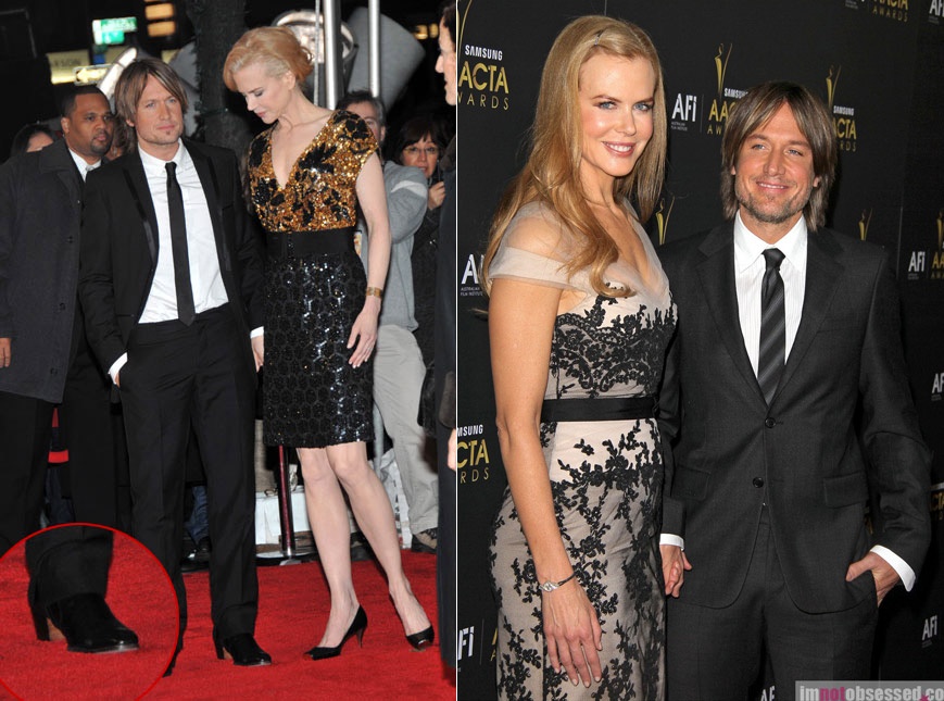 Trong khi đó, với chiều cao 1m80, Nicole Kidman lại khiến người đàn ông của mình thấy thiếu tự tin khi sánh đôi. Mỗi khi xuất hiện cùng vợ, ngôi sao nhạc đồng quê Keith Urban luôn phải đi giày.... cao gót.