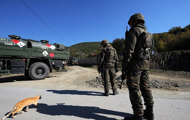| Một con mèo chạy qua vị trí của hai binh sĩ NATO tại Kosovo. Ảnh: AFP. |