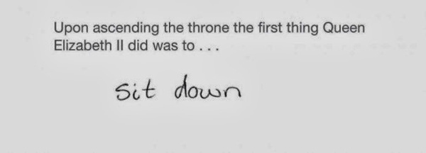Hay khi được hỏi: "Lúc lên ngai vàng, điều đầu tiên mà nữ hoàng Elizabeth II làm đó là...", người làm bài ngay lập tức đã trả lời "Ngồi xuống", đáp án của câu hỏi liên quan đến kiến thức lịch sử này không khỏi khiến người xem choáng váng.