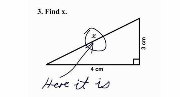 | Chuyện học sinh trả lời giảng viên, người ra đề theo những cách bá đạo qua những bài kiểm tra không chỉ xảy ra ở Việt Nam mà trên thế giới, tình huống oái ăm, cười ra nước mắt này cũng xuất hiện khá nhiều. Ví dụ trường hợp yêu cầu tìm số đo của x trong đề toán trên đây, chắc chắn người ra đề sẽ khá lúng túng vì nhận câu trả lời hồn nhiên đến mức ngô nghê của người làm bài khi thí sinh này quyết định khoanh tròn kí hiệu x trong bài và chỉ rằng: "Nó ở đây". |