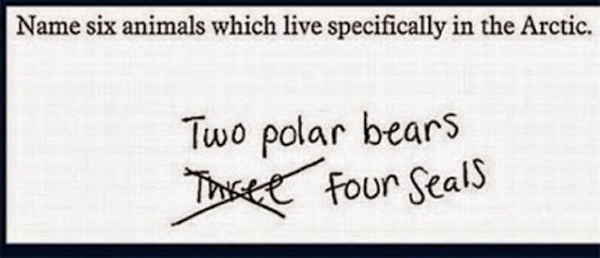 Đề bài: "Kể tên sáu động vật đặc trưng ở Bắc Cực", người làm rất lém lỉnh khi đưa ra đáp án: 2 con gấu trắng, 4 con hải cẩu, tổng cộng đúng bằng 6 con. Tuy nhiên, người chấm bài sẽ không chấp nhận đáp án đó vì Bắc Cực không chỉ có gấu trắng và hải cẩu.