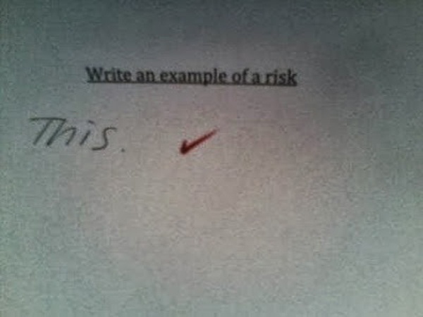 | Khi được hỏi: "Hãy cho một ví dụ về sự mạo hiểm", học sinh viết ngay vào bên dưới chữ: Đây nè, ám chỉ việc viết đáp án như vậy đã là một sự mạo hiểm khôn lường với người làm bài. Bất ngờ, đáp án này được chấp nhận vì sự sáng tạo. |