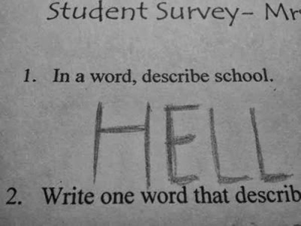 Đề bài: "Dùng một chữ để miêu tả trường học", học sinh làm bài thẳng thắn đến mất lòng khi viết vào bài thi một chữ in đậm duy nhất - "Hell" - nghĩa là địa ngục.