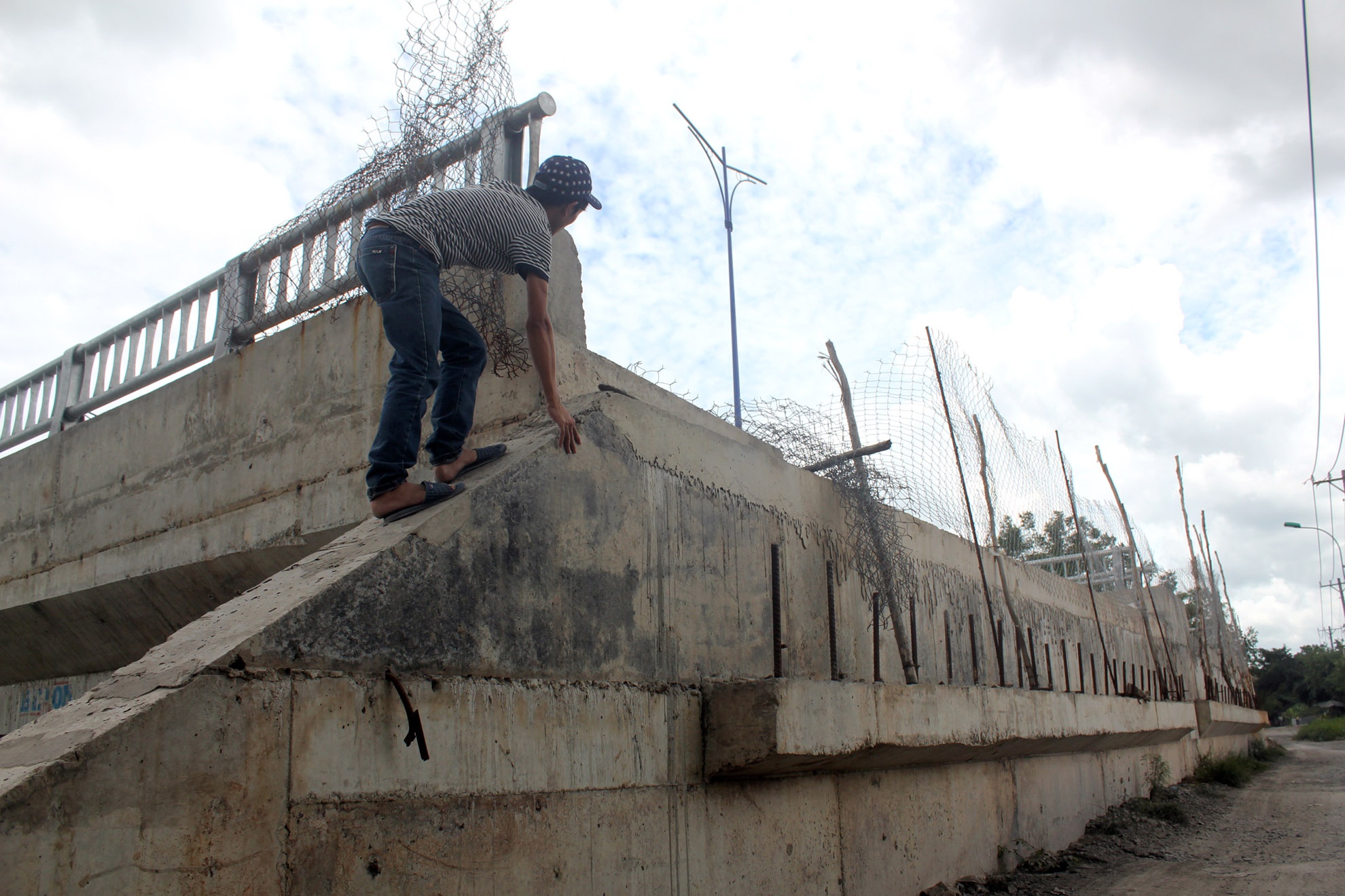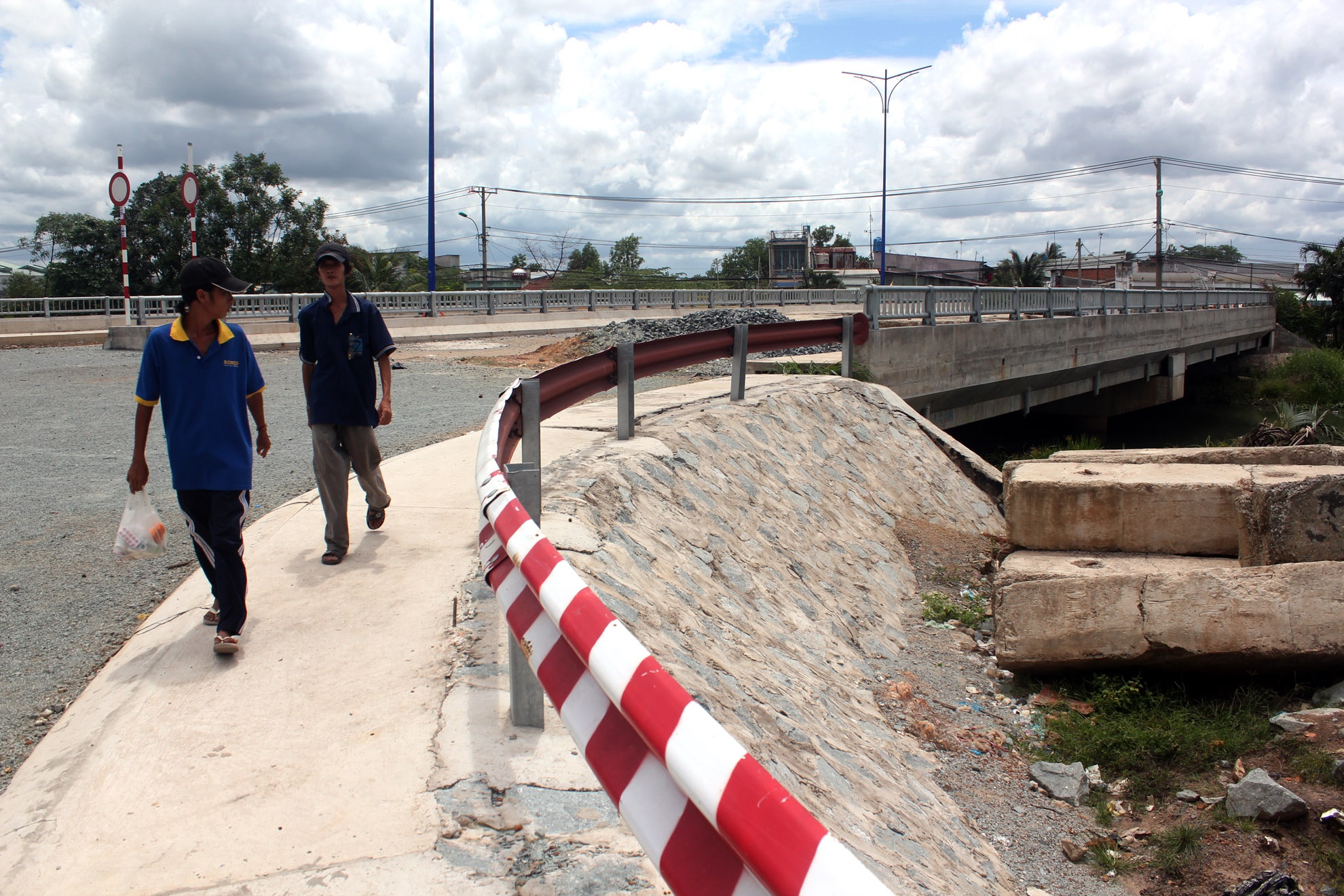 | Dù đơn vị thi công rào chắn phần cụt của cây cầu nhưng người dân đã dỡ bỏ một phần để leo cầu mỗi khi qua bên kia kênh. |