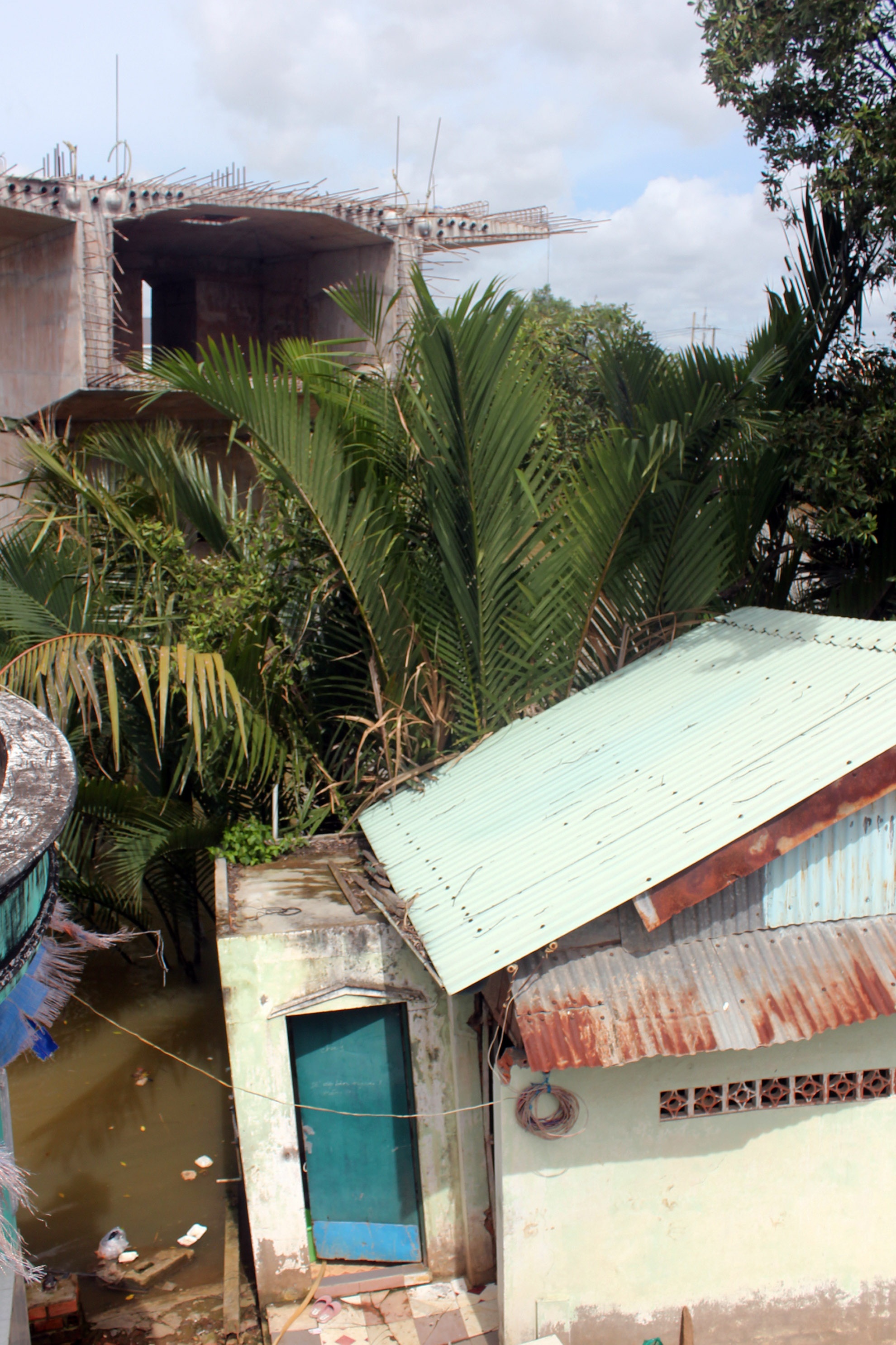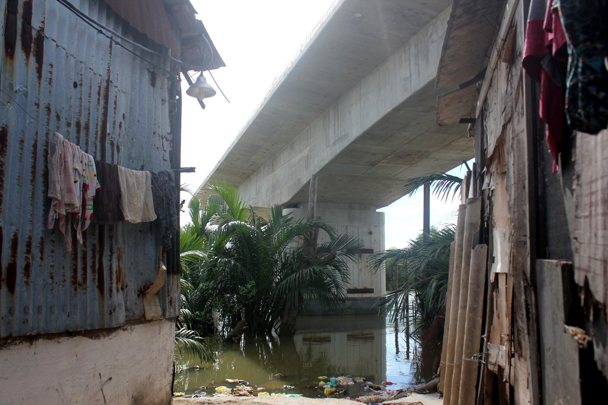 | Dưới chân cầu, những ngôi nhà cũ kỹ, chắp vá nằm san sát. |