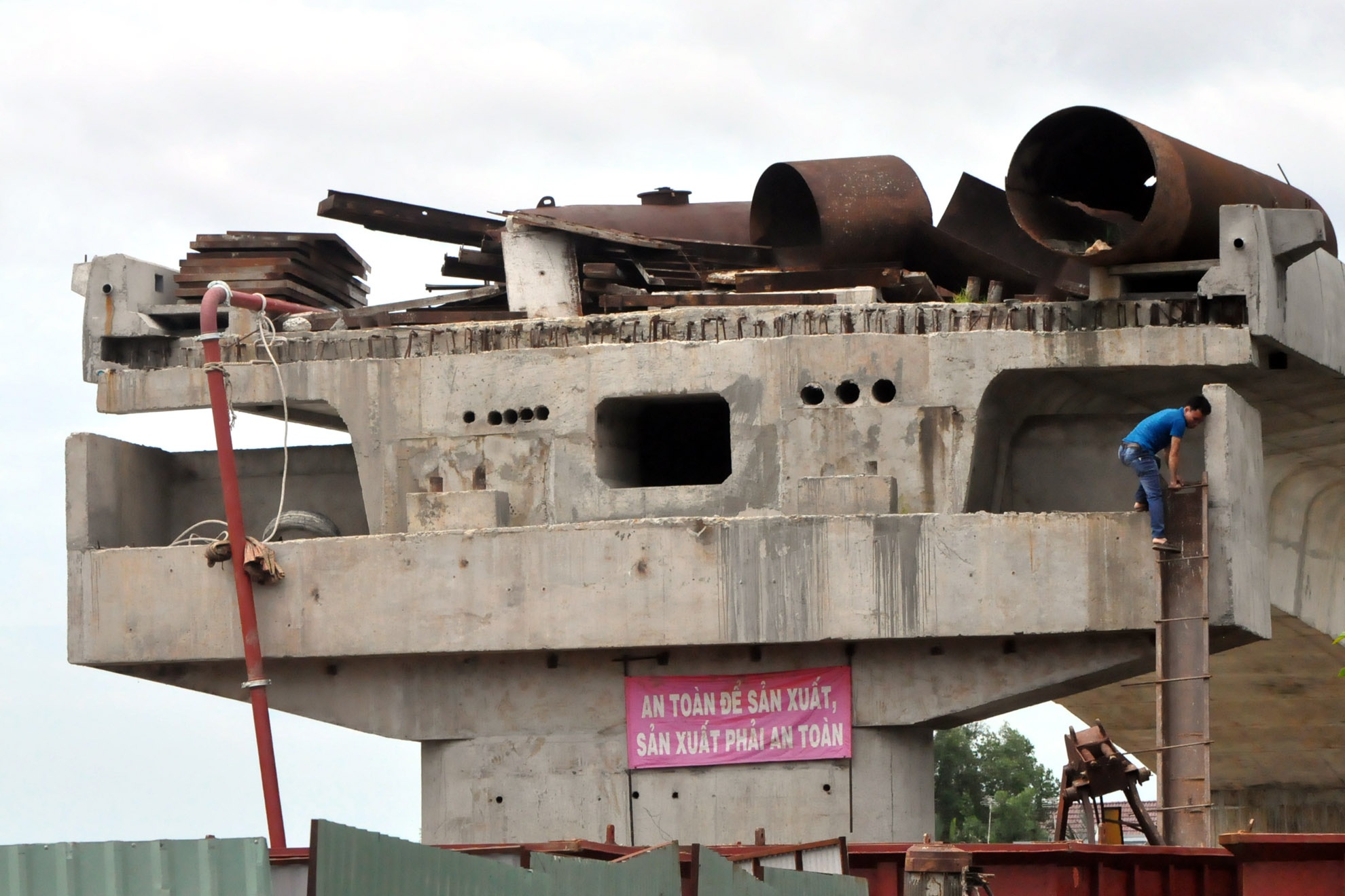 | Cầu Phước Lộc trên đường Đào Sư Tích (huyện Nhà Bè) khởi công cách đây 3 năm vẫn như thế này. Công trình đã hoàn thành được 2 trụ giữa sông và một trụ bên bờ cùng vài nhịp nối. Trong đó có một trụ và nhịp nằm trơ trọi giữa sông. |