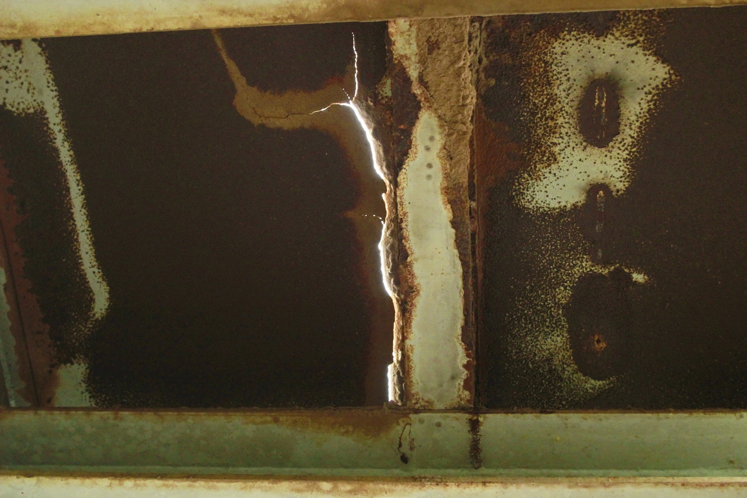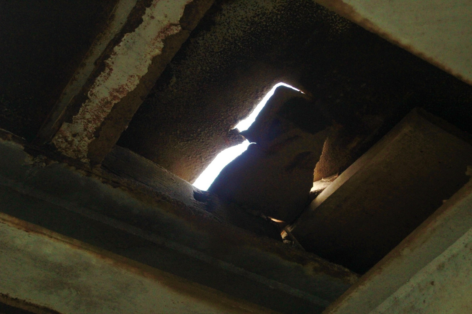 | Mặt cầu bị thủng nhiều chỗ, từng mảng sắt đang chuẩn bị rơi rụng. |