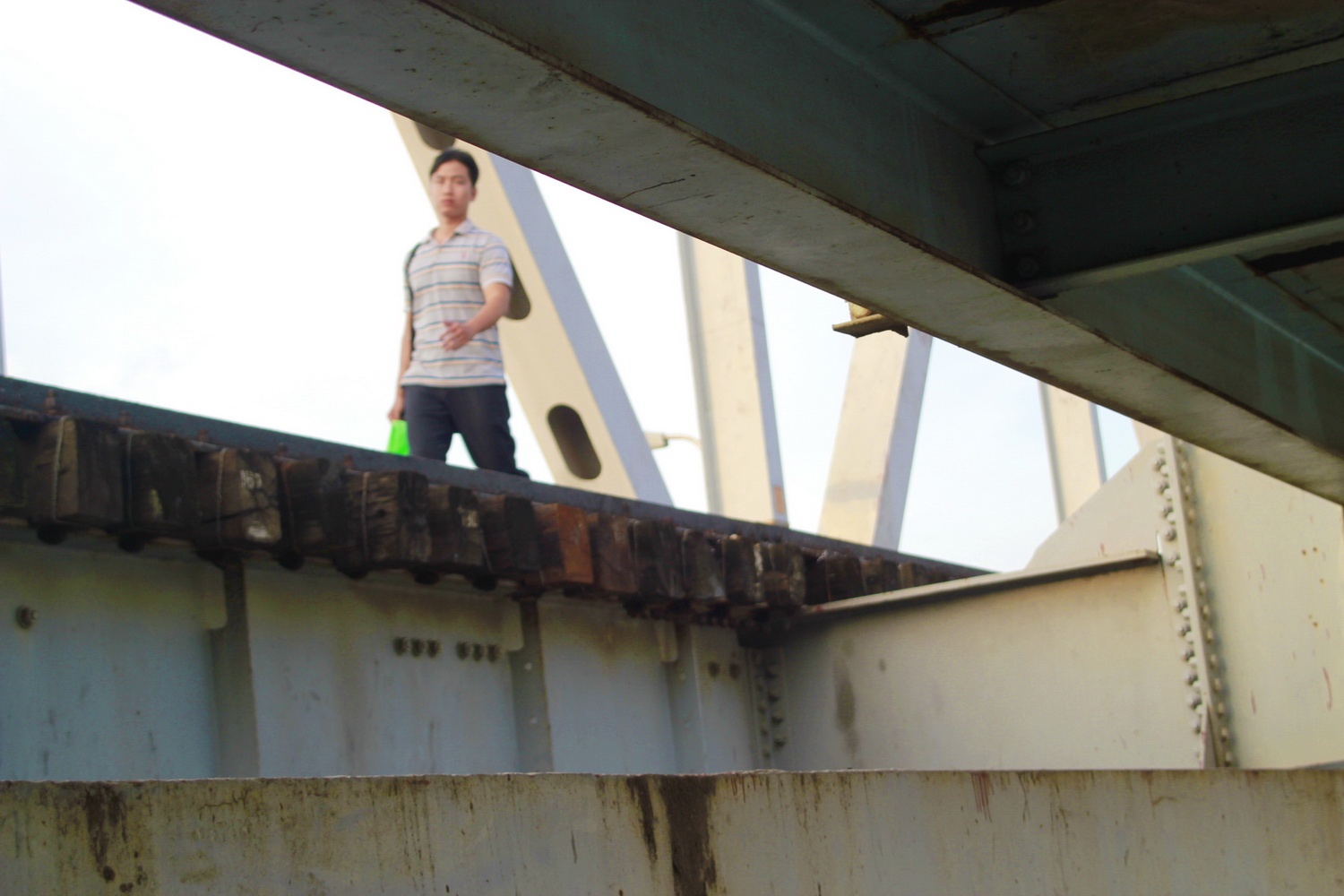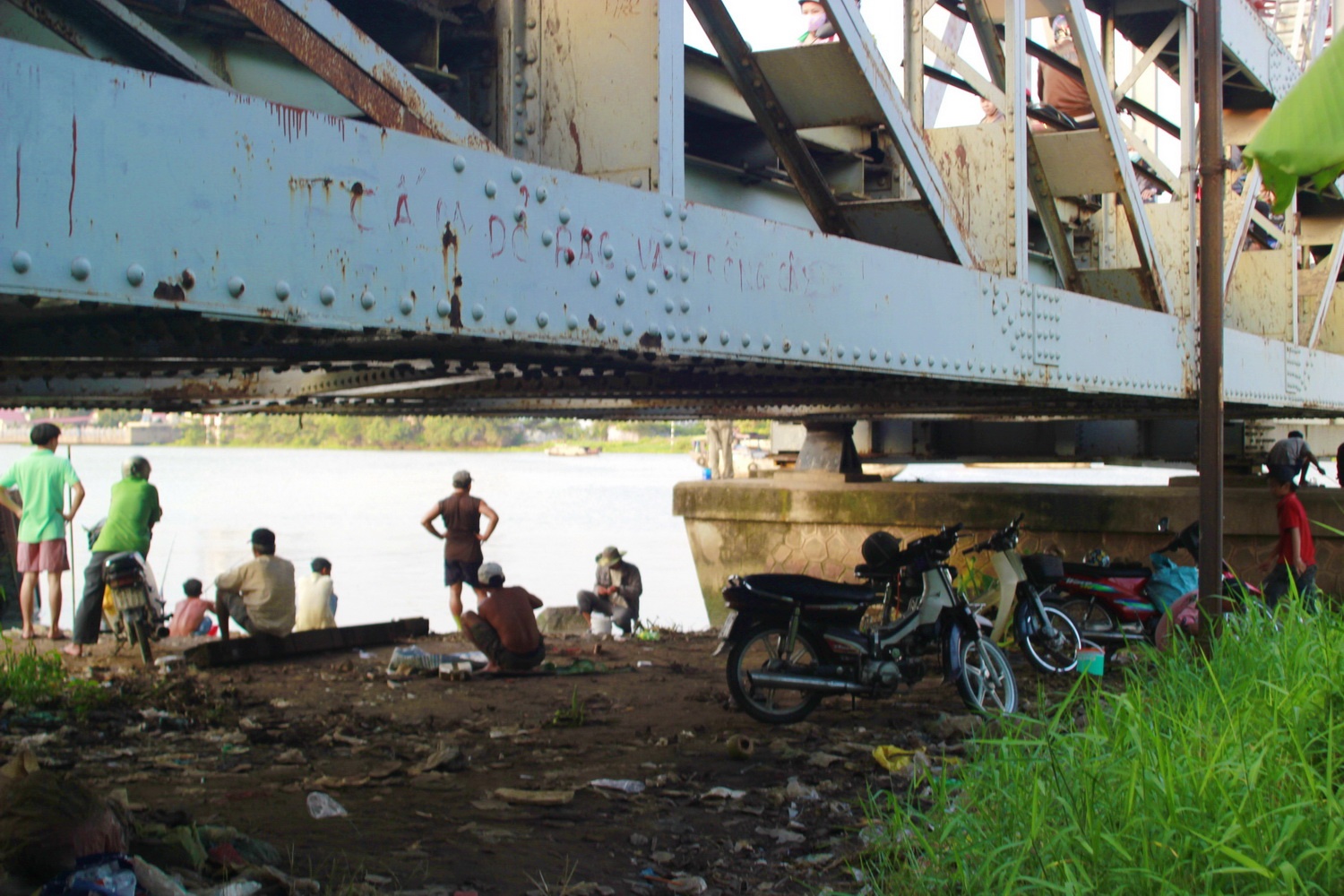 | Người dân ngồi câu cá ngay trên thành cầu, tự do đi lại trên đường xe lửa. |