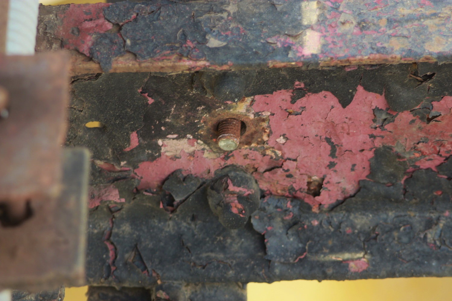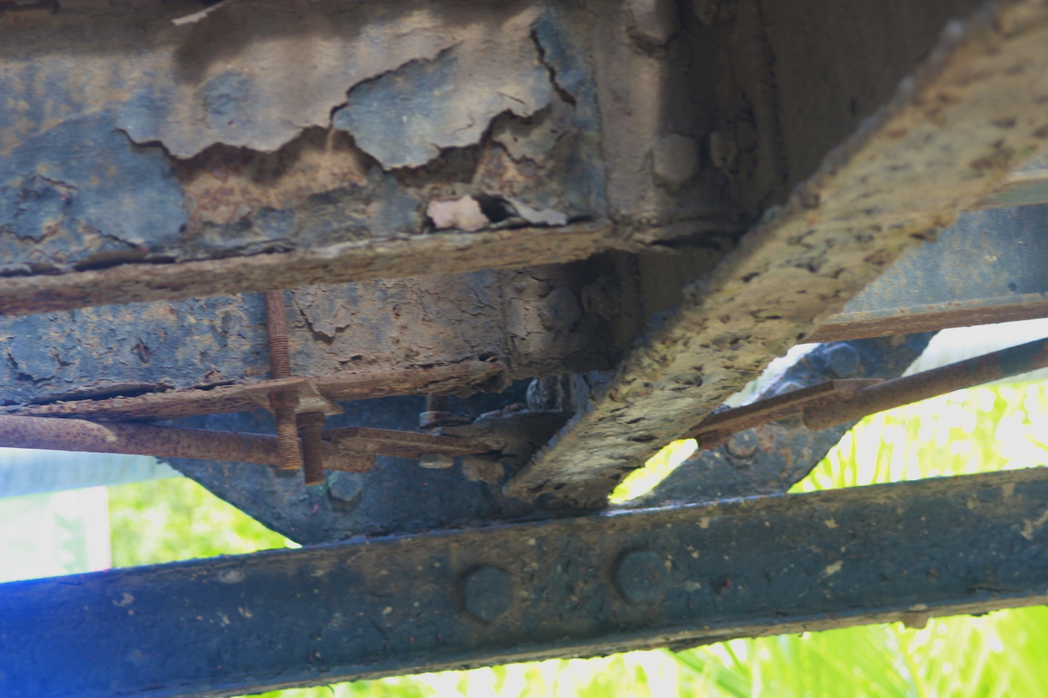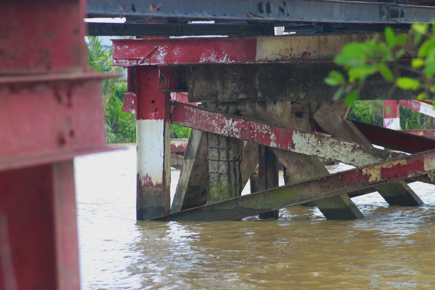 | Nhiều thanh sắt dưới dầm cầu bị gỉ sét nghiêm trọng, gia cố bằng gỗ nhưng gỗ cũng bị mục, mối mọt ăn. |