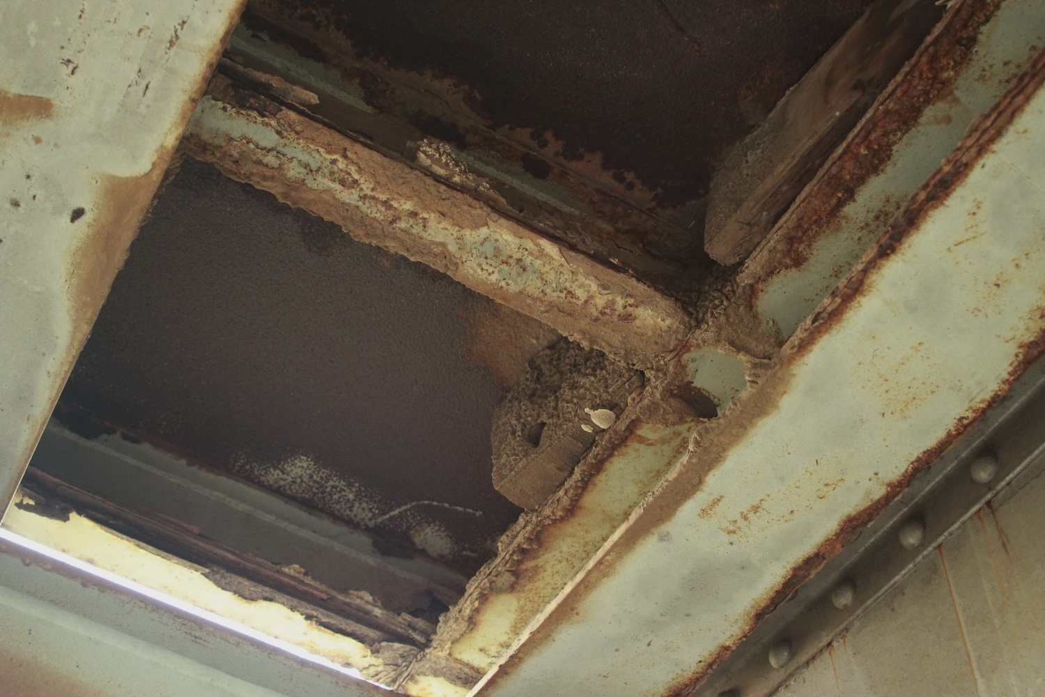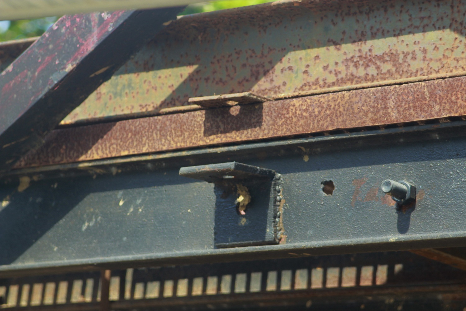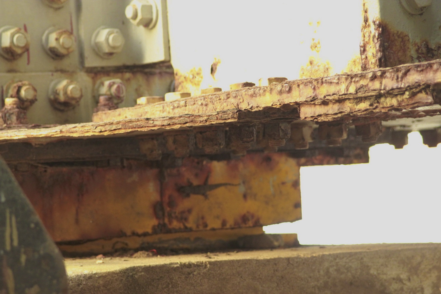 | Nhiều thanh sắt dưới dầm cầu bị gỉ sét nghiêm trọng, gia cố bằng gỗ nhưng gỗ cũng bị mục, mối mọt ăn. |