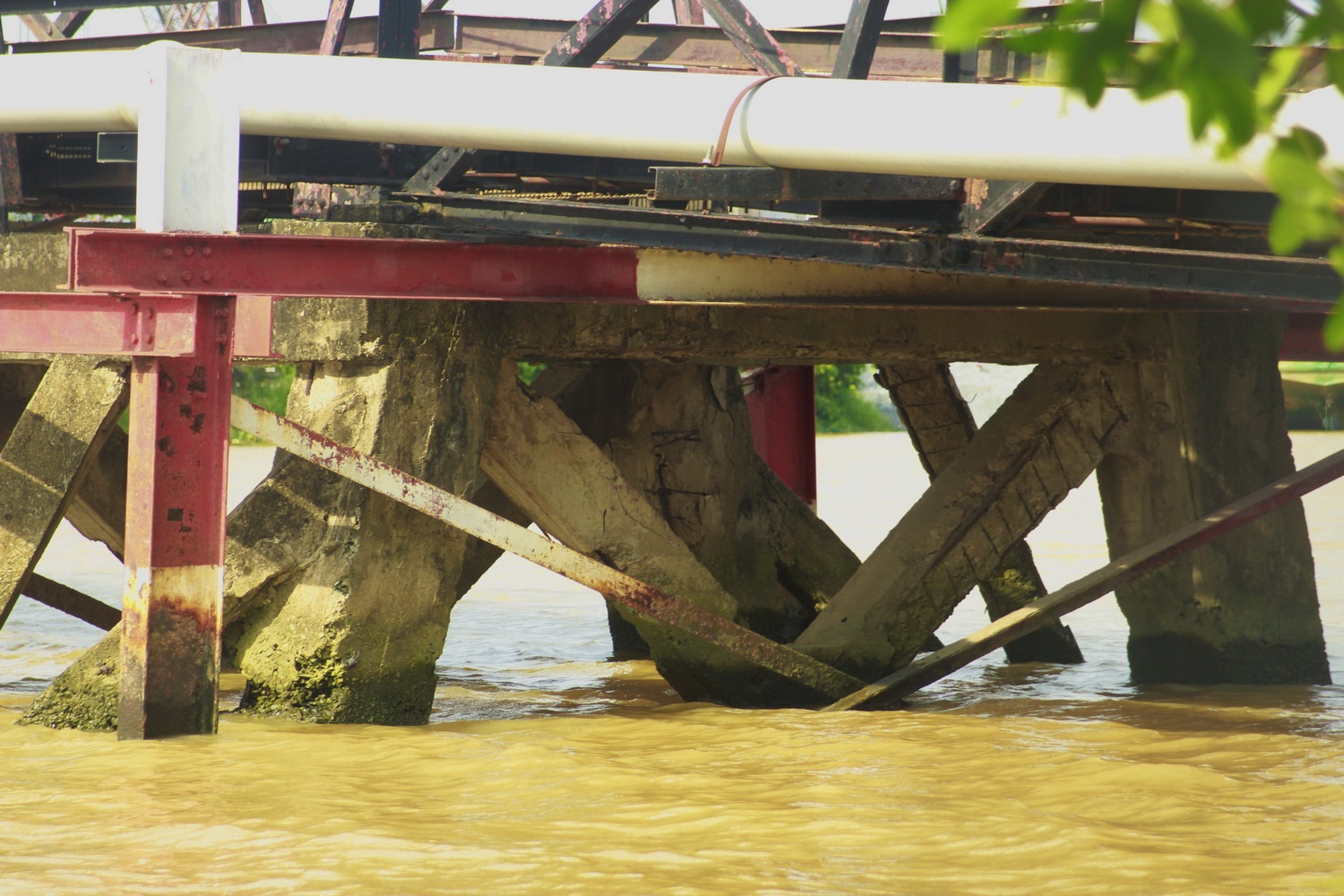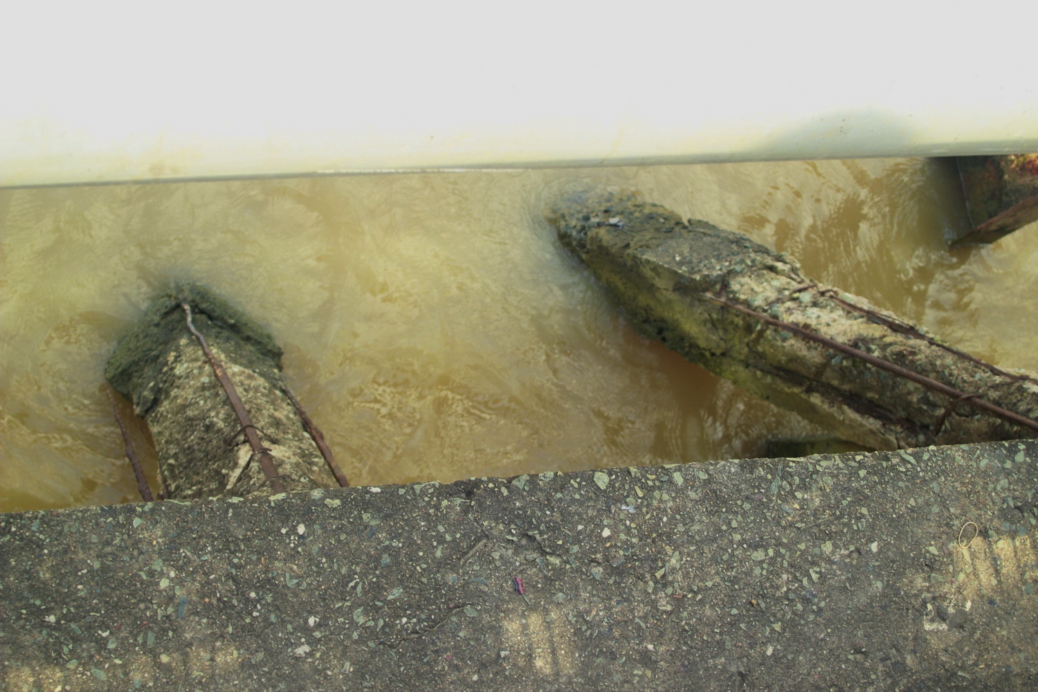 | Trụ cầu bằng bê tông trơ ra, sắt bật khỏi kết cấu trụ. |