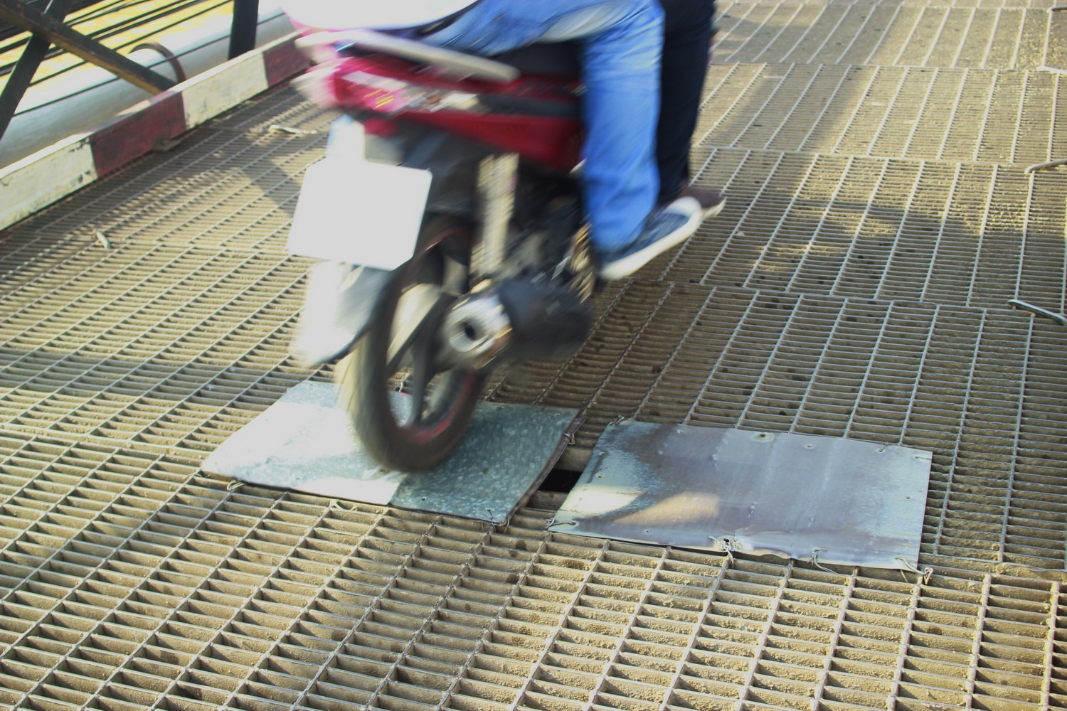 Mặt cầu không được vá bằng tấm sắt mà chỉ lót tạm tấm gỗ.