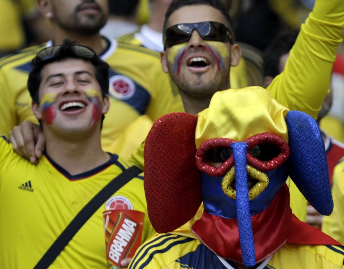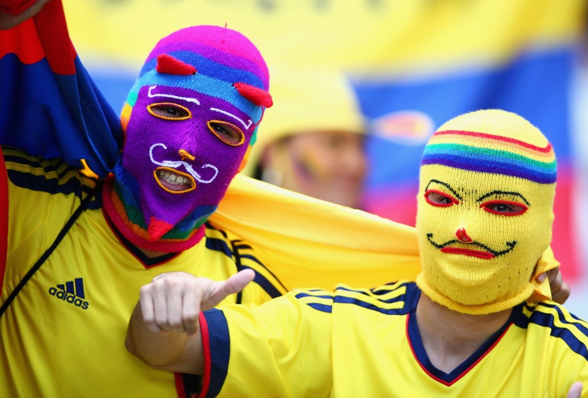 | Những chiếc mũ trùm đầu đầy màu sắc và khá hài hước của các CĐV Colombia. |