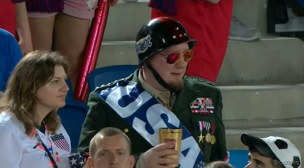 | Mang cả quốc kỳ lên đầu của một CĐV Mỹ. |